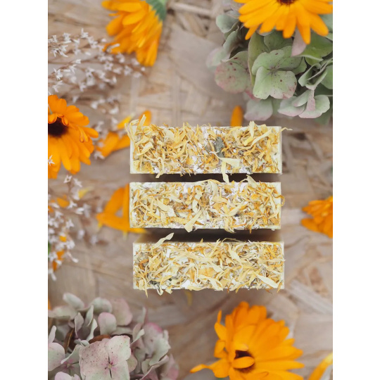 Geranium gives the soap a wonderful fragrance that lingers on the body. Its effects on nerves, stress, and overwork are also well-known. It works great on the skin as well, soothing eczema and is generally suitable for dry and sensitive skin. Calendula is one of the most commonly used herbs in cosmetics and pharmacy due to its properties.