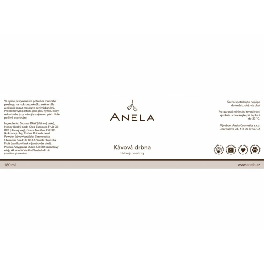 However, do not use even natural cosmetics on open wounds. This product is not intended to diagnose, prevent, or treat any disease. In case of eye contact, rinse for at least 15 minutes with lukewarm water from the inner corner to the outer corner. In case you wear contact lenses, remove them before rinsing. If irritation occurs, seek medical advice. Before the first use, it is recommended to perform the so-called patch test, i.e. apply and test the cosmetic product for its tolerance on a small area of the skin, preferably on the wrist, and wait 24 hours. This method can prevent the onset of allergic reactions and hypersensitivity to the given product. If an allergic reaction occurs after application, wash the skin surface with lukewarm water. Stop using the product immediately. If the allergic reaction persists for an extended period, seek medical assistance.Anela Cosmetics s.r.o., Dobřany 39 518 01 Dobřany, objednavky@anela.cz