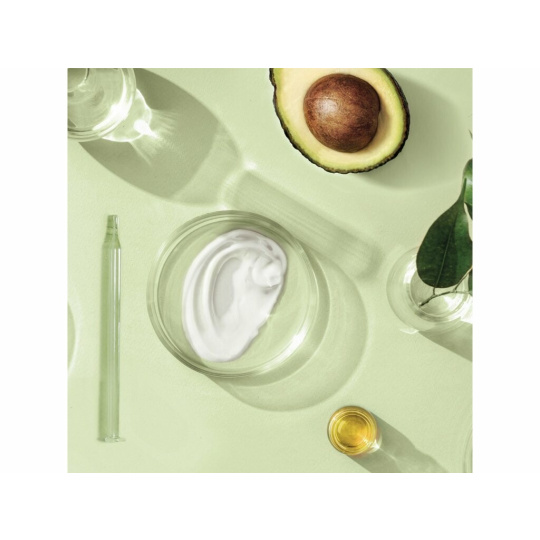- Avocado oil from upcycling nourishes the hair and restores silky shine while providing protection against heat styling.