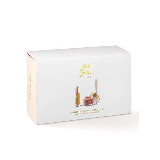 Two of our bestsellers, the Facial Oil with Bio Retinol Absolute Berry and the Floral Filter Face Mask, are now paired with two special gifts to complement your skincare ritual: the branded Gua Sha JouJou facial sculptor and the JouJou mask brush. Everything is carefully packed in a JouJou gift box.