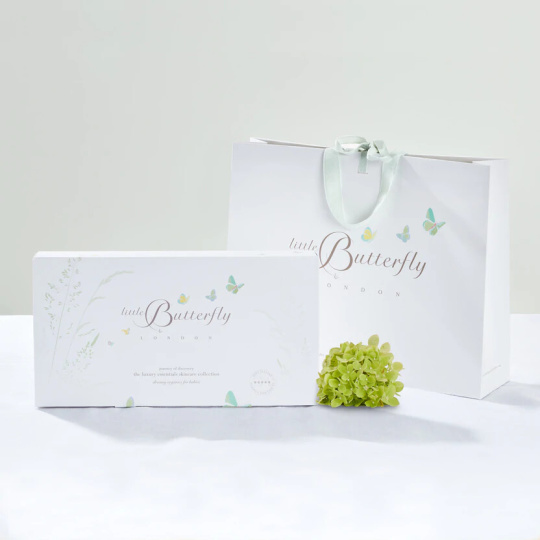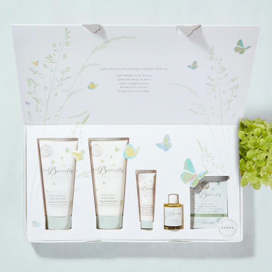 The gentlest care for newborn skin with organic products in one set. A convenient gift set of five luxurious products will satisfy even the most demanding mom. Five best-selling organic certified baby skincare products in convenient travel sizes – all beautifully presented in a stunning gift set and placed in a luxurious branded bag. Ideal for exploring the Little Butterfly range or as a gift for an expectant or new mother.