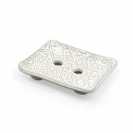 Soap dish on legs, with ring-shaped holes for water drainage.