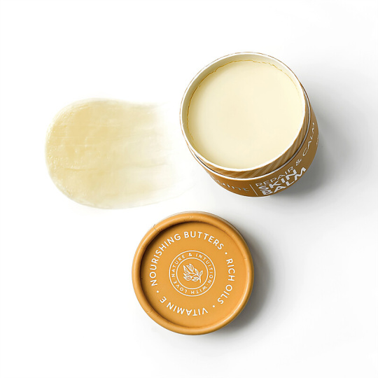 Regenerating balm with apricot, tangerine, and macadamia oils, cocoa butter, calendula, avocado, beeswax, and almond wax effectively hydrates and nourishes.