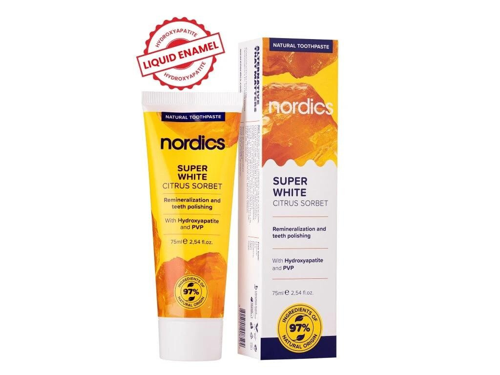 Nordics SUPER WHITE has an amazing composition that combines natural remineralization with one of the most effective ingredients known to help maintain white teeth. This toothpaste contains 97% ingredients of natural origin. Nordics Super White was developed for people who want to restore the natural strength of their teeth while maintaining their bright white color. The active ingredients are hydroxyapatite (also known as liquid enamel) and PVP. Hydroxyapatite restores and fills micro-cracks in the enamel and aids in the remineralization of teeth. PVP (polyvinylpyrrolidone) is one of the most trusted ingredients that fights against tooth discoloration.