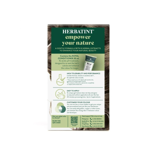 Usage: Read and carefully follow the instructions. All shades of Herbatint can be mixed together to create your own shade, but the same volume of color and developer must always be used. You can also mix a coloring shampoo for a wash-out color from Herbatint colors. How to proceed with dyeing already colored or otherwise treated hair? LIGHTENED HAIR: Herbatint can restore your hair's natural color. Since lightened hair is more porous, we recommend a shade lighter than the one you have chosen. Shorten the application time by ten minutes and avoid cool and ashy tones. HAIR WITH PERM: Do not dye your hair immediately after a perm. We recommend a two-week interval, using a shade one degree lighter than you have chosen, and reducing the application time by 10 minutes. HAIR AFTER HENNA APPLICATION: Henna coats the hair, which prevents the color from penetrating the hair. You should wait until the henna is completely washed out or the hair grows out.