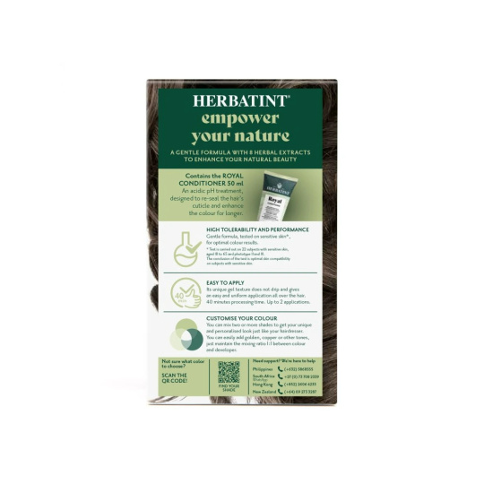 The color gives hair an intense color and shine. Hair looks fresh, regenerated, silky smooth, and strengthened. Thanks to its gel consistency, the paint is very easy to apply and completely odorless. The entire dyeing process takes no more than 40 minutes. Moreover, Herbatint does not test its products on animals and is also suitable for vegans. On our blog, you can check out the color chart of all the colors we offer in our e-shop. Remember that the resulting color after dyeing may not always match the color on the box. It depends on the original hair color, the genetically determined pigment in the structure of your hair, which may not be visible in the natural hair color, but some Herbatint colors can highlight it; also on the current color (i.e. what color was applied before Herbatint), or whether you have regrowth, gray hair, or highlights.