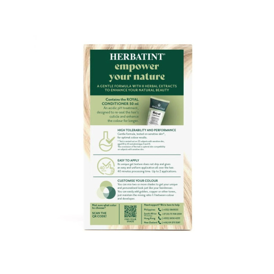 Usage: Read and carefully follow the instructions. All shades of Herbatint can be mixed together to create your own shade, but the same volume of color and developer must always be used. You can also mix a coloring shampoo for a wash-out color from Herbatint colors. How to proceed with dyeing already colored or otherwise treated hair? LIGHTENED HAIR: Herbatint can restore your hair's natural color. Since lightened hair is more porous, we recommend a shade lighter than the one you have chosen. Shorten the application time by ten minutes and avoid cool and ashy tones. HAIR WITH PERM: Do not dye your hair immediately after a perm. We recommend a two-week interval, using a shade one degree lighter than you have chosen, and reducing the application time by 10 minutes. HAIR AFTER HENNA APPLICATION: Henna coats the hair, which prevents the color from penetrating the hair. You should wait until the henna is completely washed out or the hair grows out.