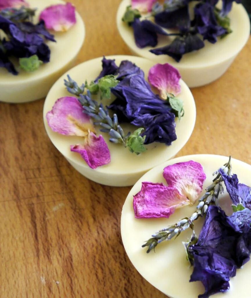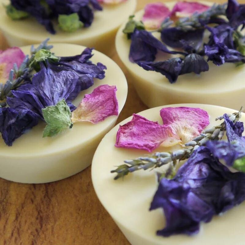 Dried lavender, rose, and mallow flowers are only lightly adhered to the surface of the cube; we recommend removing them before the massage.