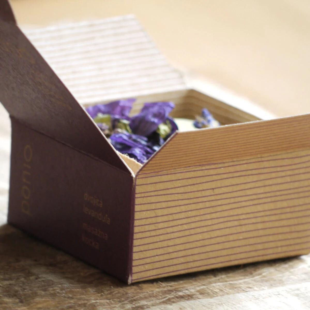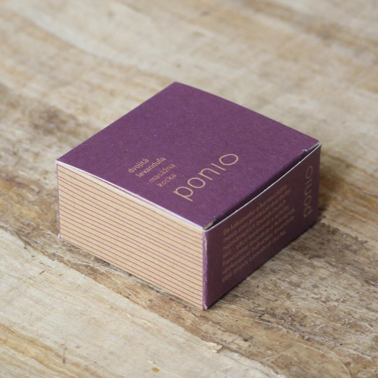 The massage cube is a handmade product containing cocoa butter, shea butter, and two types of lavender essential oils – the beautifully scented French lavender and the traditional Bulgarian medicinal lavender. This "massage bath cube" is suitable for use during bathing, showering, or massage and is ideal for relaxation and stress relief. When used, it dissolves on the skin, leaving it supple and soft.