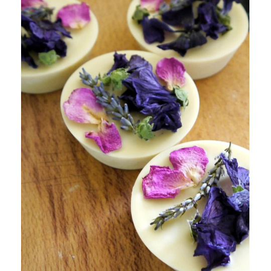 Massage cube with two types of lavender essential oils - beautifully fragrant floral lavender 40/42 and traditional medicinal lavender of the angustifolia type from Bulgaria. The cube contains the ideal ratio of cocoa and shea butter to melt at just the right moment on the skin. Each massage bar has undergone a "tempering" process to ensure it is beautifully smooth and free of lumps. Dried lavender, rose, and mallow flowers are only gently embedded on the surface of the cube; I recommend removing them before the massage.