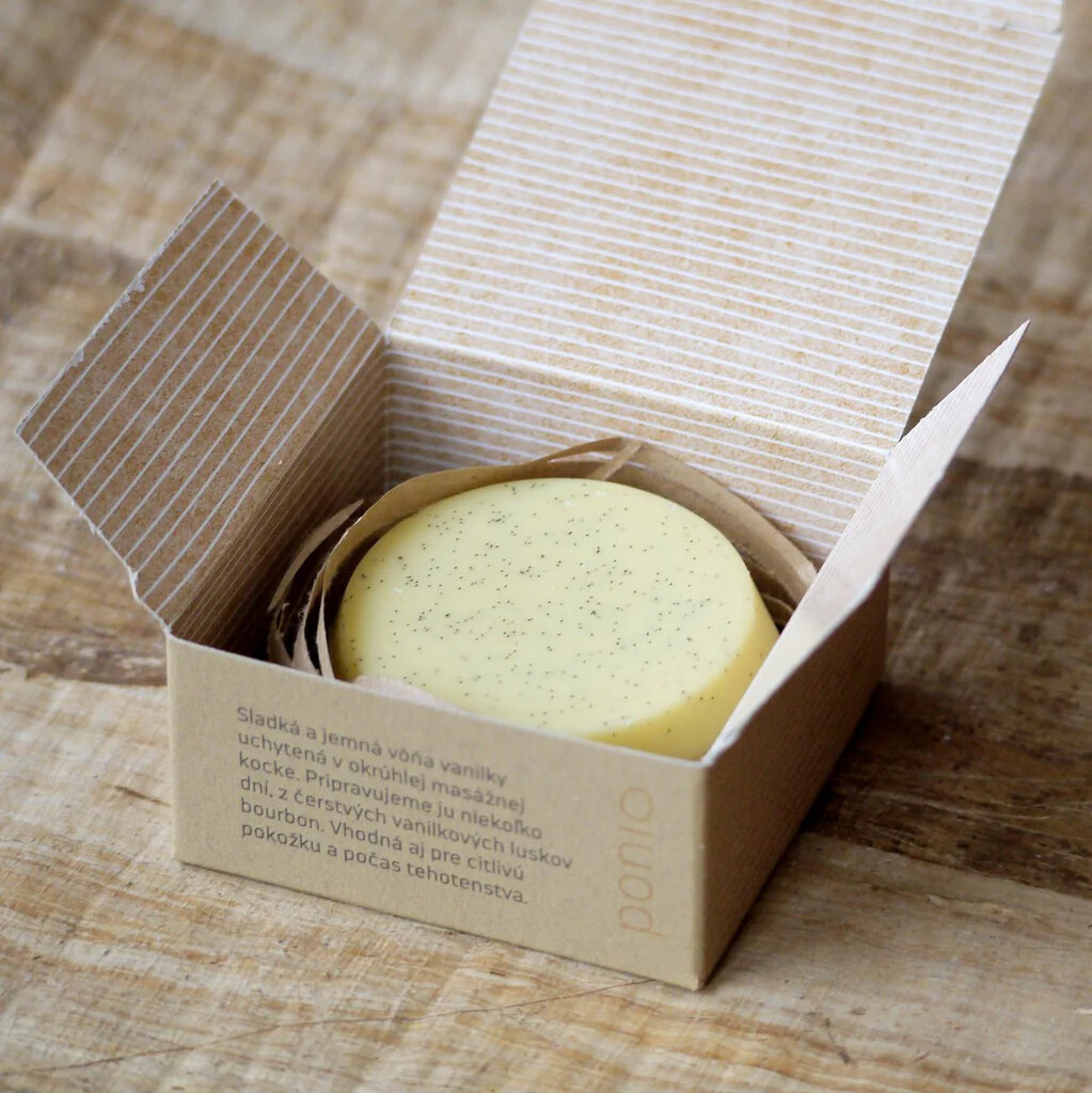 Vanilla massage bar is a natural product with a delicate and sweet scent of bourbon vanilla pods and cocoa butter.