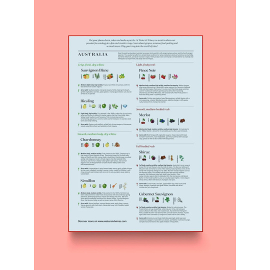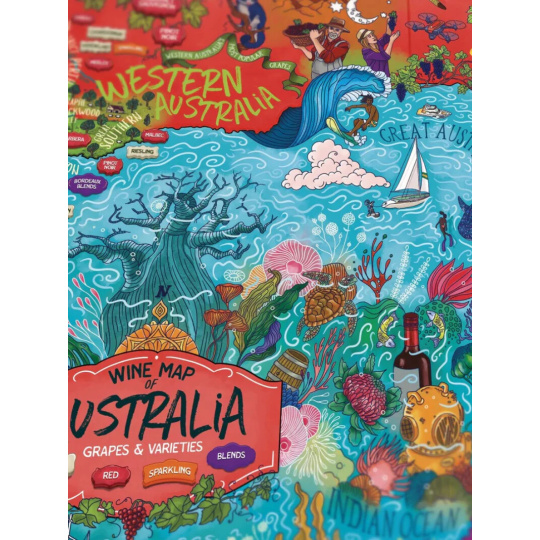 Puzzle featuring Australian wine regions and key varieties typical for Australia. Australia is renowned primarily for its wine varieties Shiraz and Pinot Noir, and you can find approximately 60 wine regions within its territory. This puzzle was created in collaboration with the best Australian sommeliers and artist Derek Fenech. You will gain a comprehensive overview of the main wine regions and local varieties, from the famous Barossa Valley to the cool climate of the Yarra Valley.