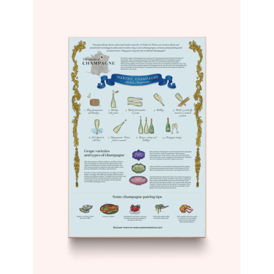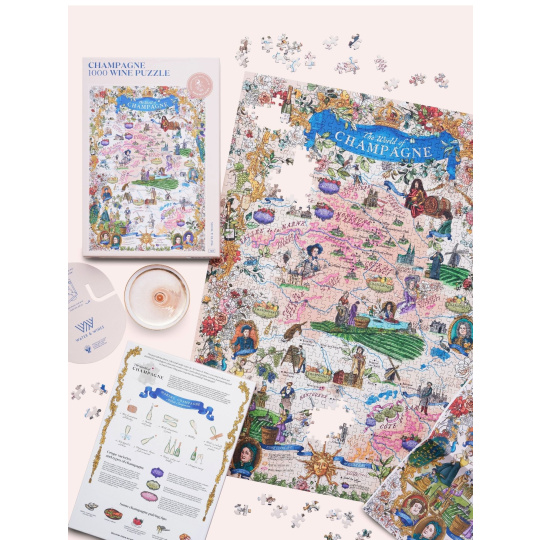 Puzzles depicting the main areas of Champagne, the villages of Grand Cru and the rich history of the region. The hand-painted artwork was created in collaboration with wine master and champagne specialist Essi Avellan, with illustrations by Derek Fenech. In the box, along with the pieces and poster, you'll also find lots of information on making champagne and tips on food pairing!