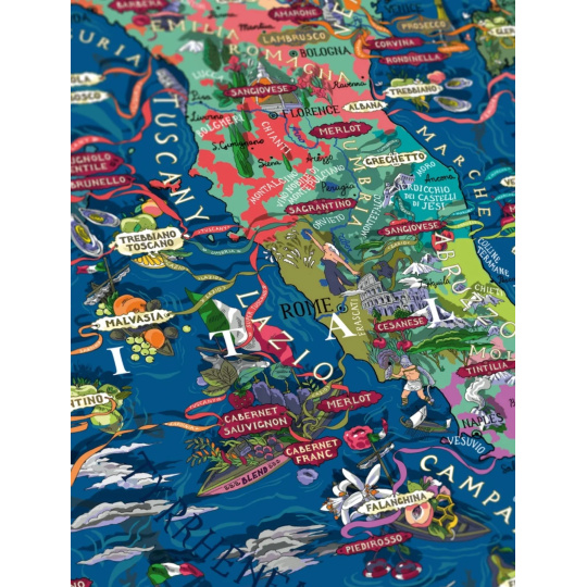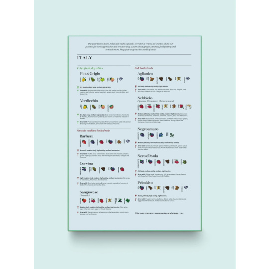 A puzzle with the theme of Italian wine regions and key varieties typical for Italy. The box also contains profiles of each variety, their characteristic aromas and flavours with lots of tips for pairing with food! The illustrations were first hand-drawn by Nikita Kulikov, then carefully checked with the help of the world's best sommeliers.